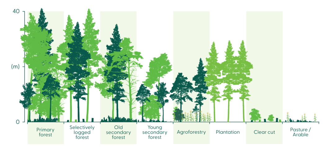 Forest management conserving biodiversity seen on the left. Intensively managed (often monocrop) operations seen on the right. Figure by “Plantation Forests and Biodiversity: Oxymoron or Opportunity?”