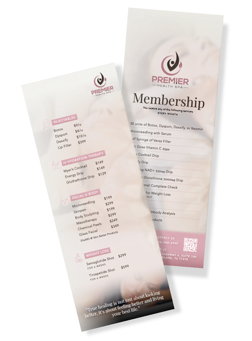 Give customers the experience they are expecting with professional branding and curated designer marketing. Every print marketing piece is a solution to bring and keep clientele—Use each sale as an opportunity to keep return leads coming back for another experience. Custom branded keepsakes can contribute to the brand’s consumer loyalty. Or use your branding to continue the brand experience even after your customers buy your service, and leave a lasting impression that makes them return again and again.